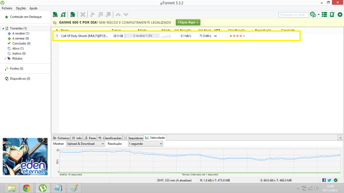 4º Depois de carregarem na transferência vai aparecer a janela do uTorrent, esperam até acabar a transferência, e está feito o download: